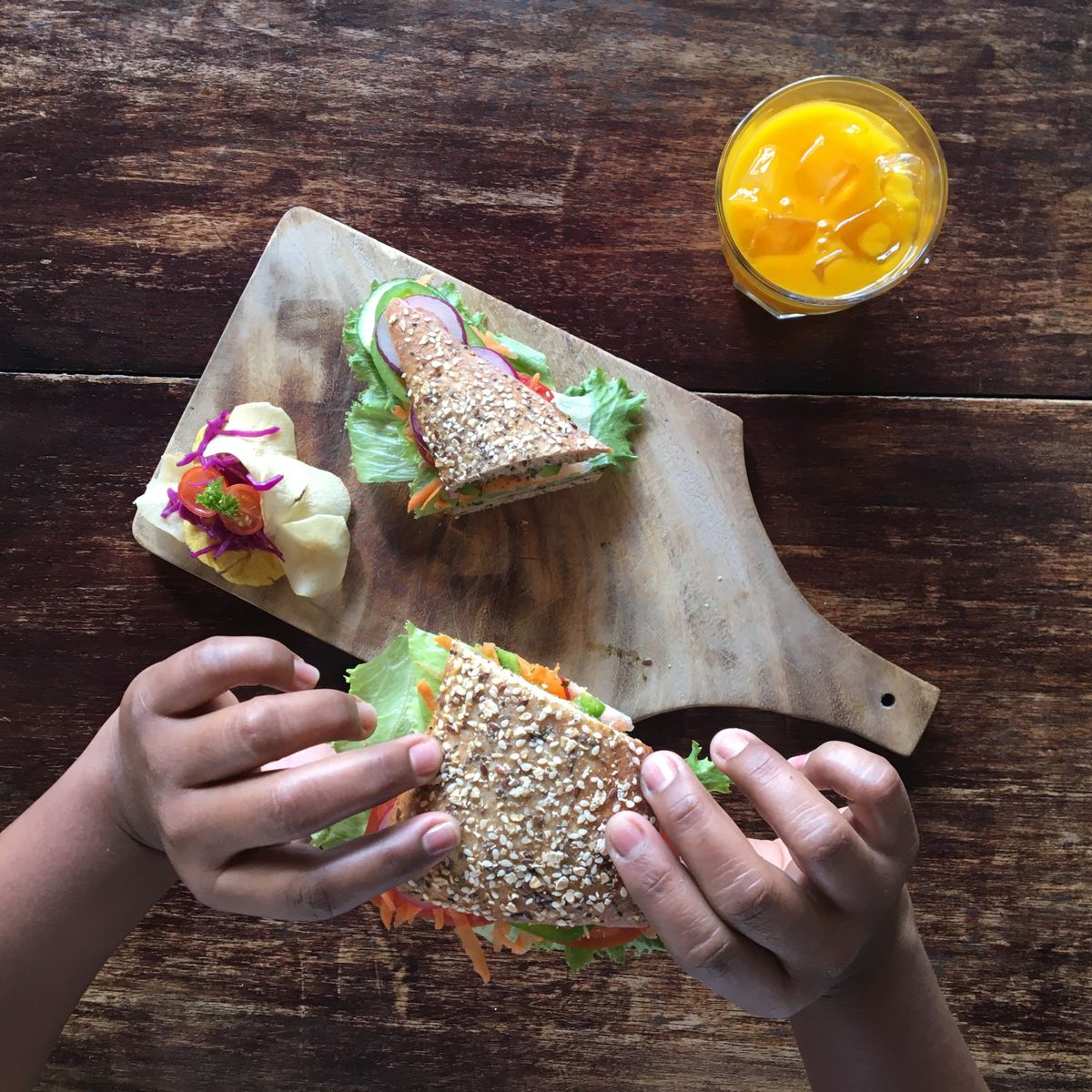 Un sandwich con pollo desmenuzado y nuestro pesto casero de albahaca y marañon