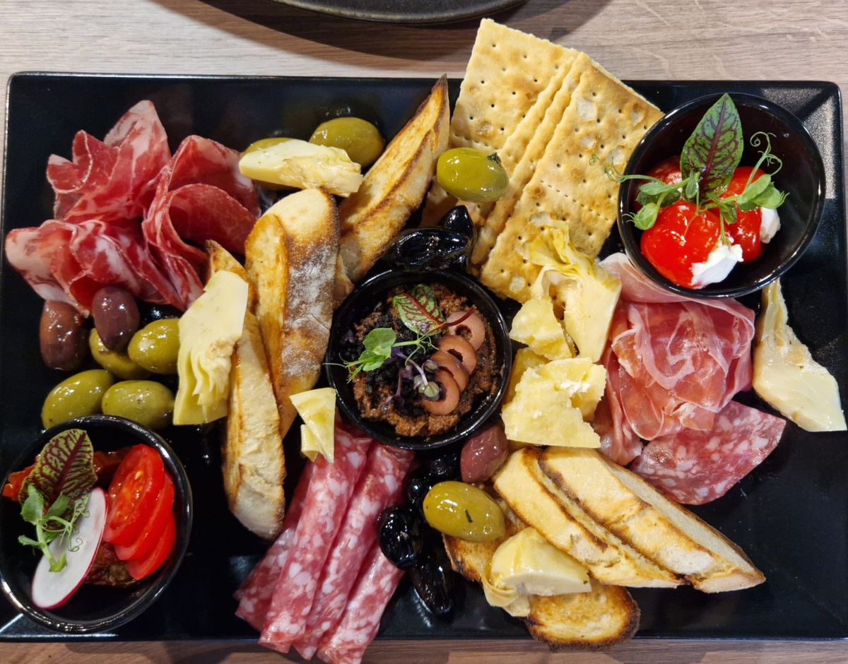Anghinare, Rosii uscate, Masline, Ardei umpluti cu branza, Prosciutto crudo, Coppa, Salami, Parmesan, Crackers, Pasta masline, Paine ciabata