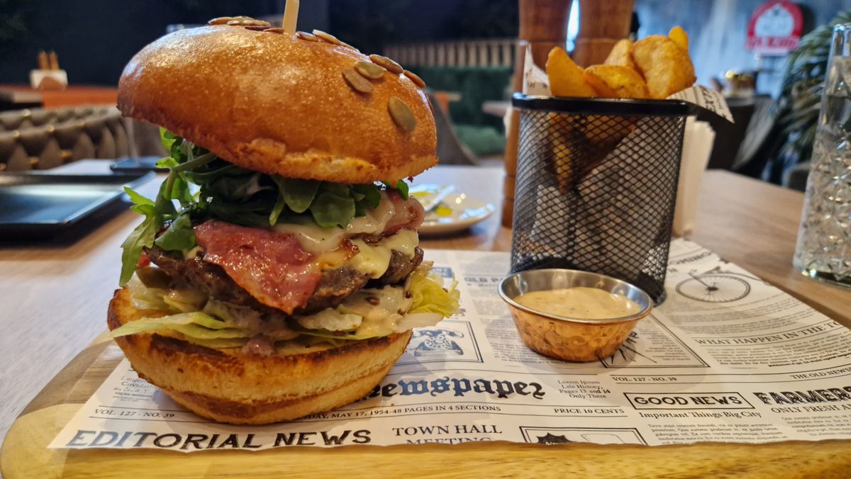 Chifla caramelizata*, Carne de vitel, Branza cheddar, Bacon, Iceberg, Castraveti murati, Ceapa, Sos burger, Cartofi dippers si Sosul Casei Picant -