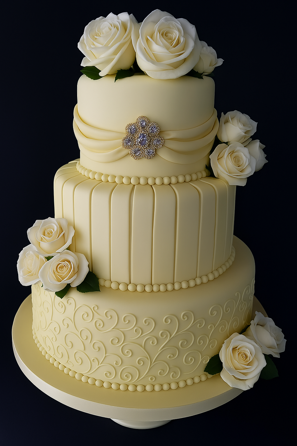 This luxurious three-tier cake is covered in smooth ivory fondant and decorated with elegant details. The bottom tier features intricate scrollwork, while the middle tier is adorned with vertical pleats and delicate pearl-like borders. The top tier is draped with fondant swags, gathered by a sparkling brooch. Fresh white roses accent each tier, adding a romantic and timeless touch—perfect for weddings or grand celebrations.