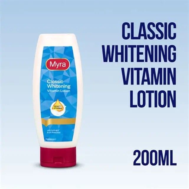 The Myra Classic Whitening Vitamin Lotion is a daily body lotion designed to nourish skin, fade dark spots, and even out skin tone. It is formulated with "Beauty Vitamins" to promote a brighter, more radiant complexion. The lotion has a lightweight, non-greasy texture and is hypoallergenic and dermatologist-tested, making it suitable for all skin types, including sensitive skin.