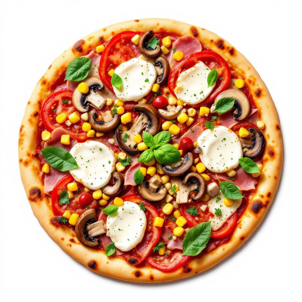 Mozzarela / Tomate fresco / Cogumelo / Milho / Fiambre / Chouriço