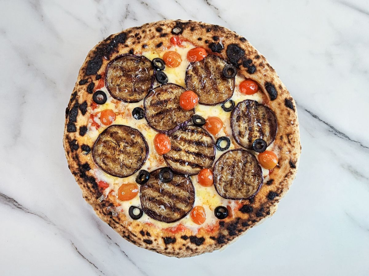 Tomato base | Chargrilled Aubergine | Roma tomatoes | Olives | Mozzarella | Parmigiano