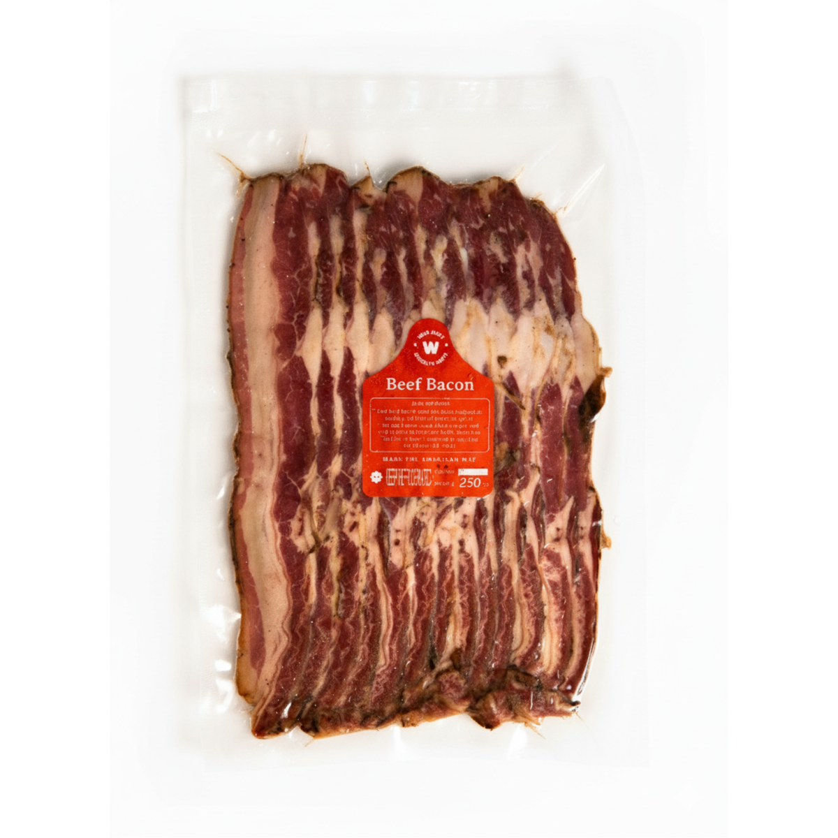 Prepared using the same time-honored methods as traditional American bacon. The beef is cured in a blend of brown sugar, black pepper, and curing salts for at least five days, then slow-smoked for three hours until perfectly flavorful and tender.