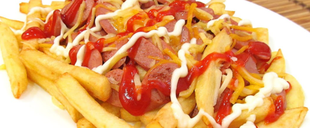 ( Papa frita + Salchicha +Queso Cheddar + Mayonesa y Salsa de Tomate )