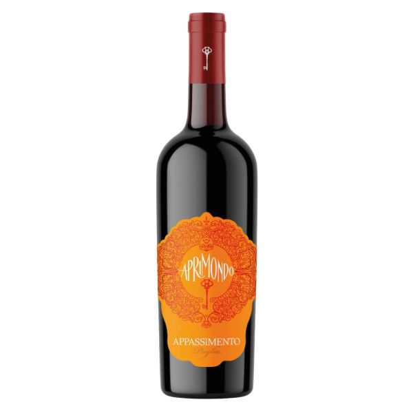 El vino tinto Appassimento Aprimondo, de las colinas de Apulia, se elabora con uvas Negroamaro, Merlot y Malvasia Nera secadas varias semanas. Fermenta en acero inoxidable a temperatura controlada. 16 % Grado alcolico
