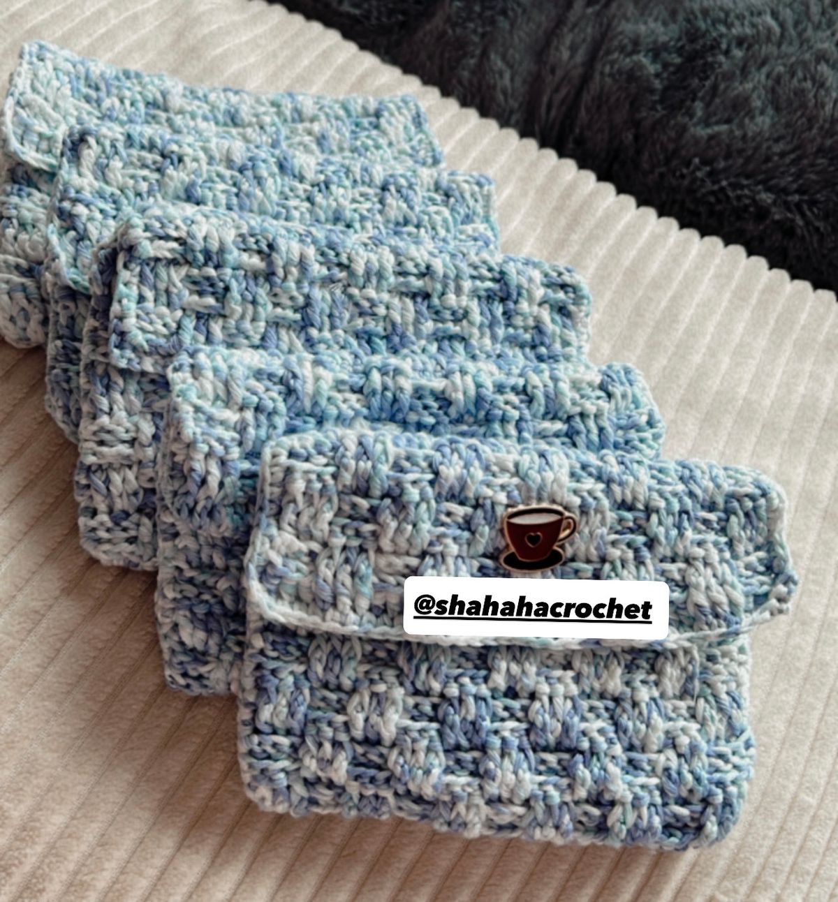 This little pouch is handmade with love using the classic basket weave stitch, giving it a cozy, textured look that feels extra special. The soft cotton yarn in a pretty blue and white mix makes it both sturdy and stylish. Each pouch is one-of-a-kind, adding a touch of handmade charm to your everyday essentials. Size: Approx. 5β (13cm) wide Γ 4β (10 cm) tall (folded). - Just about the size of a packet of tissue paper.