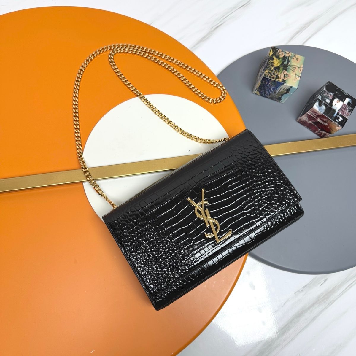 Descripción: bolso estructurado con solapa frontal y logo metálico YSL; un ícono del lujo parisino que combina elegancia atemporal y versatilidad.
