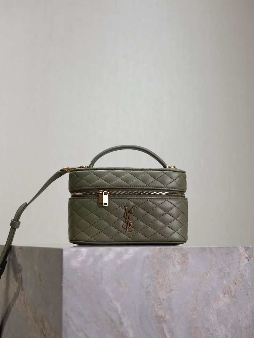 Descripción: bolso tipo vanity case con asa superior y correa ajustable, ideal para llevar lo esencial con estilo; su silueta estructurada y el icónico logo YSL lo convierten en un accesorio elegante y versátil.