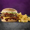 A 100% pure beef patty, boneless pork rib patty, a slice of cheese, dills, lettuce, and tomato with our delicious Steers® sauces and seasoning. Meal includes a medium portion of our Famous Hand-cut chips.