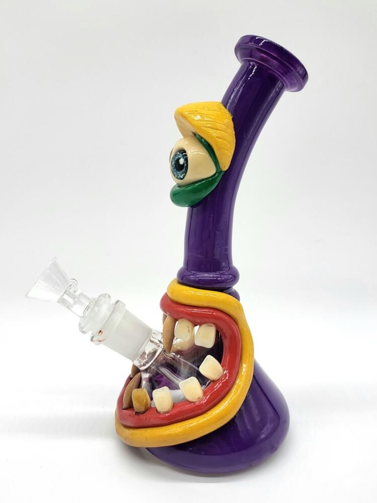 These 3D Art Purple Mini Monster bongs are uniquely designed to be unlike any of your other bongs. Their vibrant designs bring the glass bong to life and will be sure to spark conversations all night long. On top of this, the accents on the bong glow in the dark. The bong is made of high-quality borosilicate glass, with a thickness of 5mm. . The bong is 17cm in height, and the socket & cone piece is 14mm.