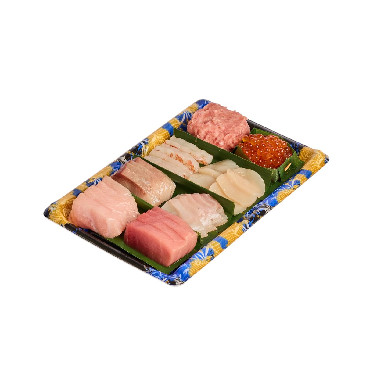 4 slices Otoro, Chutoro, Buri, Madai/Mekajiki Belly, Aka Ebi