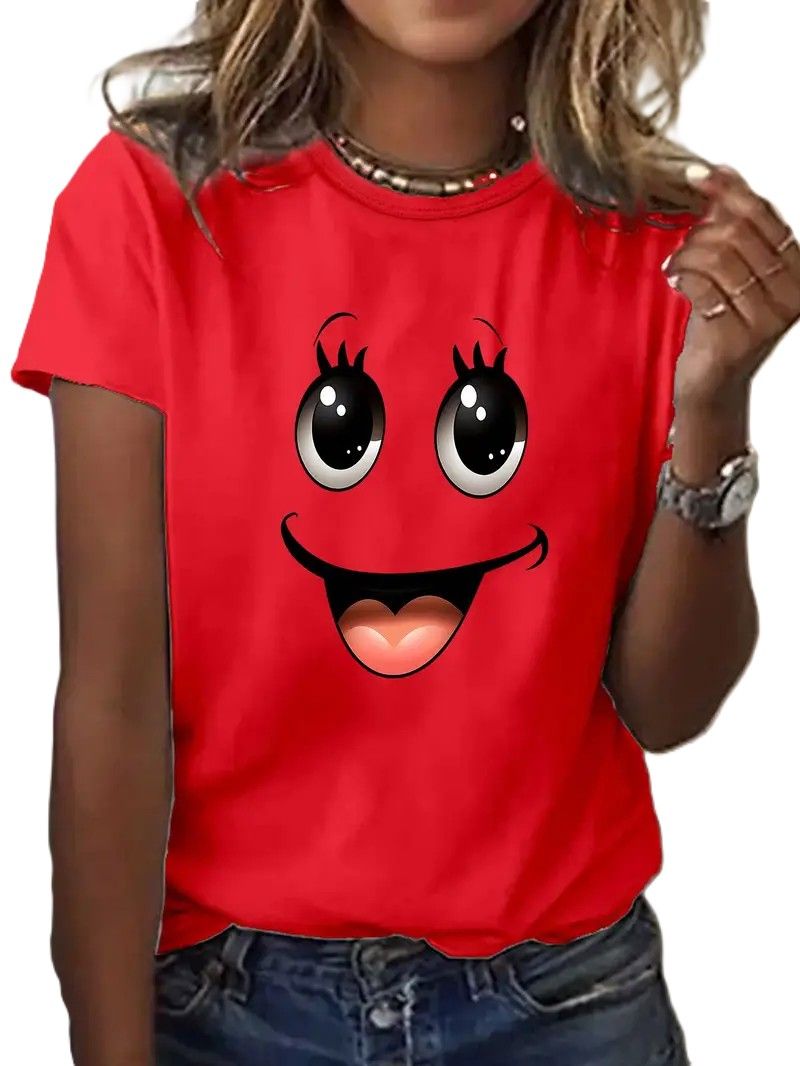 Camiseta feminina casual com estampa de carinha sorridente e gola redonda | Manga curta, comprimento regular, moda para todas as estações, blusa com estampa de carinha sorridente de desenho animado
