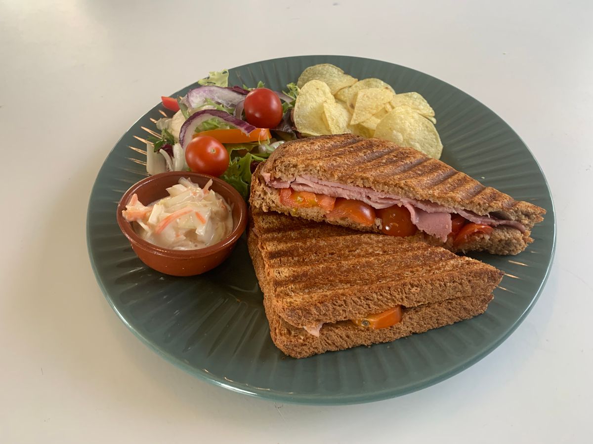 A selection of toasted sandwiches with various fillings, served with a salad garnish, crisps and homemade slaw. Brown, white or sourdough bread.
