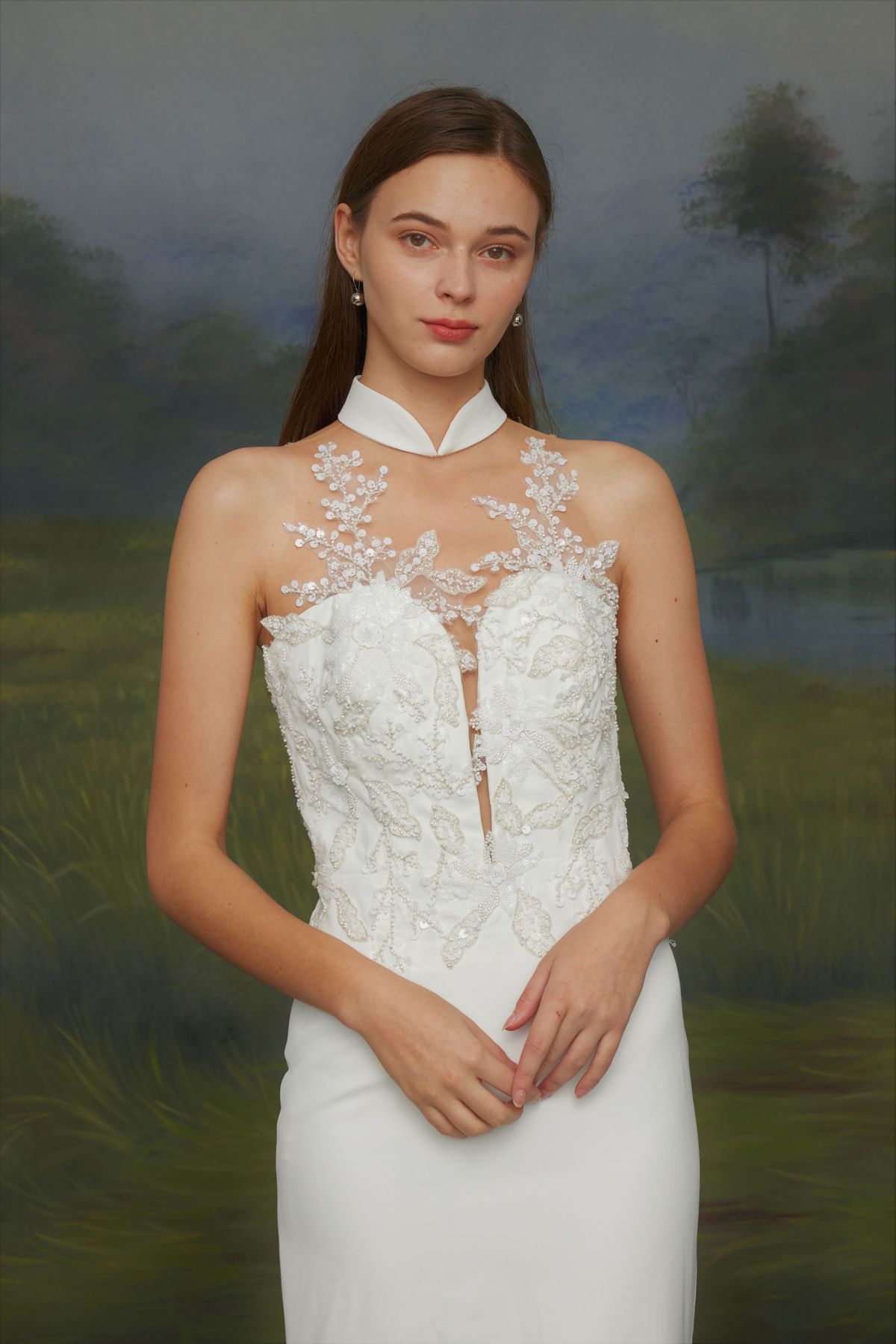 Bridal Cheongsam with Hand Embroideries on illusion sweetheart neckline and back.