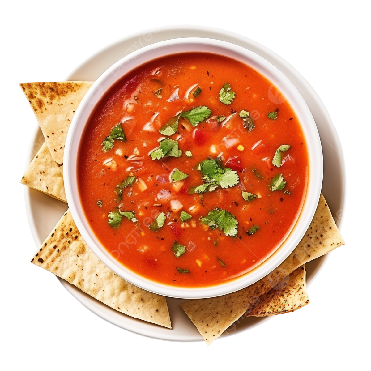 Sopa de tomate acompañada con chips de tortilla.