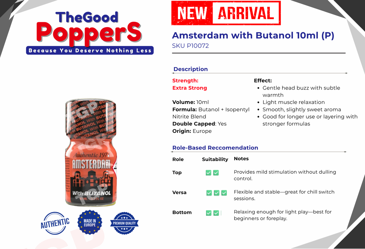 Amsterdam Butanol 10ml offers a milder, more controlled hit compared to amyl or propyl blends—ideal for those who want the pleasure without overwhelming intensity. Its balanced formulation makes it beginner-friendly yet satisfying for seasoned players who appreciate a slower, more sensual build-up. Crafted in Europe for safety and consistent quality, this is your go-to for long, indulgent sessions.