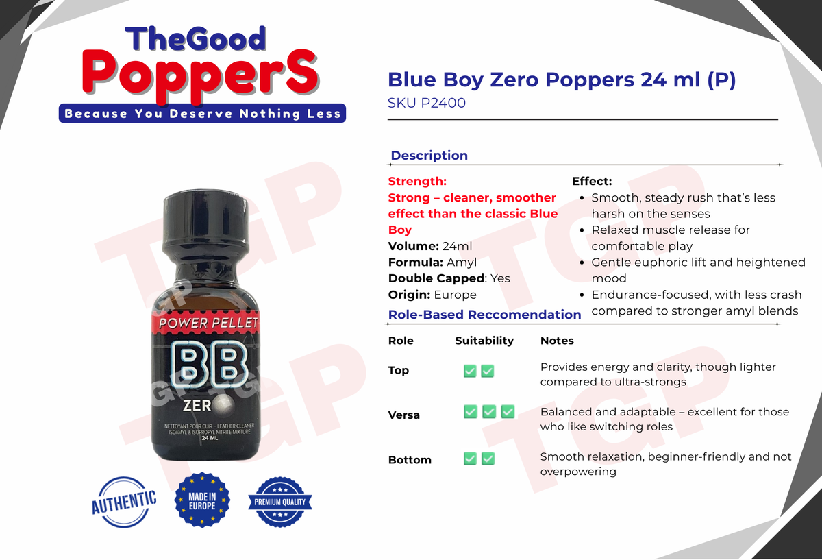 Dive into smooth, electrifying sensations with Blue Boy Zero 24ml, a premium European-made popper crafted for fast-acting, ultra-potent stimulation. Its high-quality formula delivers a rapid, intense surge that heightens every intimate moment, now in a larger 24ml bottle for extended enjoyment.