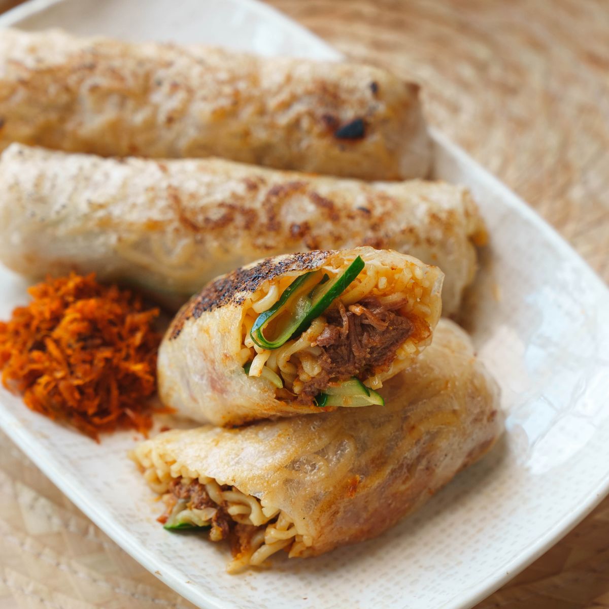 β¦ Our favourite tender beef rendang recipe mixed with Indomie noodles, wrapped in rice paper rolls and grilled nice & crisp!