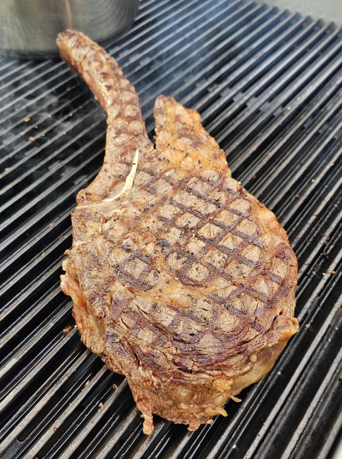 Looks Grand, Thick Piece of Meat, Tender and Juicy. As compared to the Angus Tomahawk, this is More Tender, Less Beefy, More Fatty. Seared on Grill, Served with Sea Salt and Black Pepper.