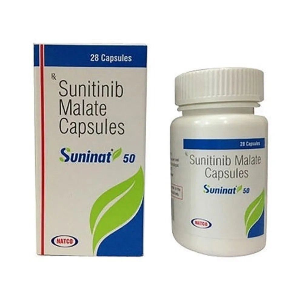 Suninat 50Mg Capsule is a cancer medicine that blocks the growth and spread of cancerous cells in the body. It is used to treat types of tumors of the kidney, pancreas and digestive system.