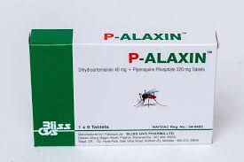 P-Alaxin is an antimalarial medication that combines Dihydroartemisinin and Piperaquine Phosphate. It is primarily used for the treatment of uncomplicated malaria, particularly caused by Plasmodium falciparum and other malaria species. Each pack typically contains 9 tablets, making it suitable for a short treatment course.