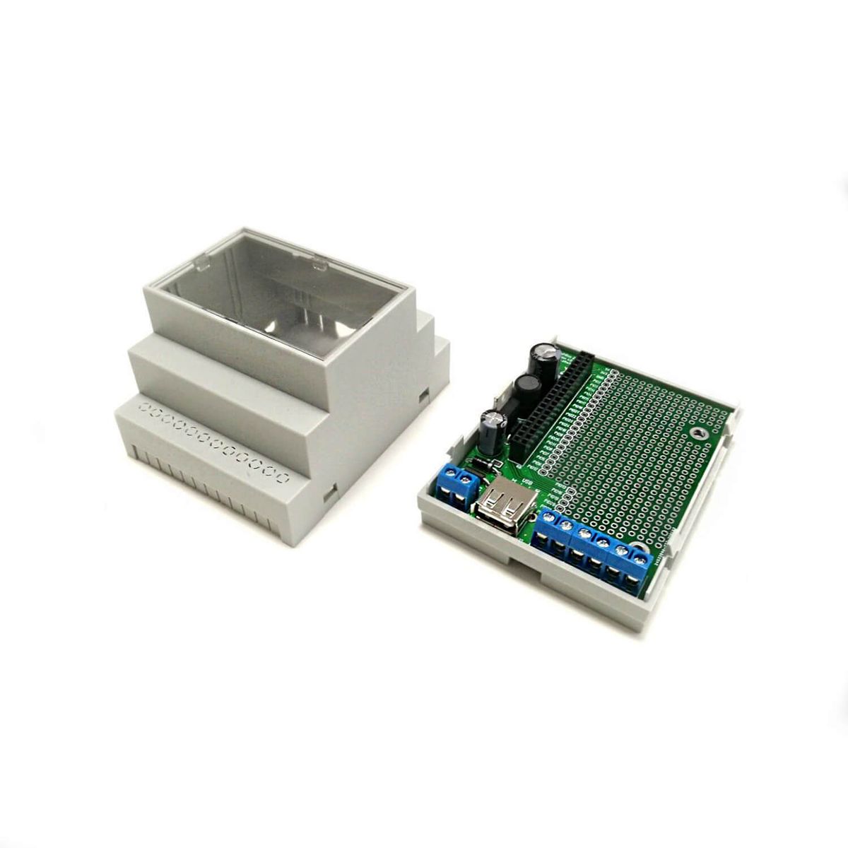 pre-milled 4 HP DIN rail housing with transparent top partBoard for plugging in the Raspberry Pi Zero