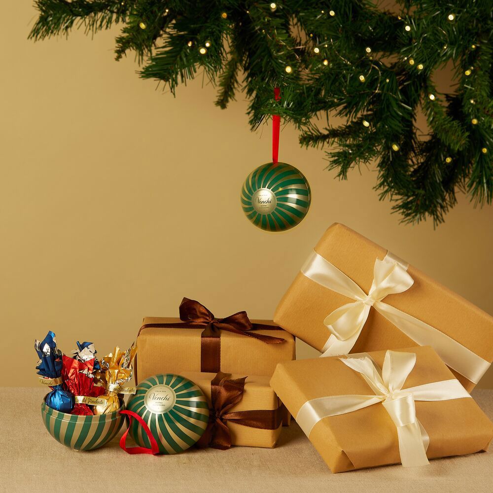 An elegant bauble design available in two colors, holding 4 Christmas limited-edition chocolates. Perfect as a tree ornament while carrying sweet festive surprises.