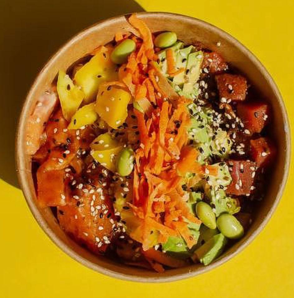 Trocitos de atún fresco, aguacate, mango, cebollino y edamame. En una base de arroz de sushi, servido en vinagreta thai y ajonjoli.