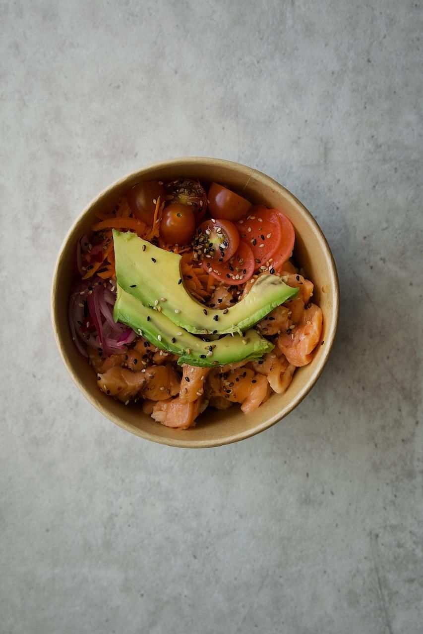 Trocitos de salmón, edamame, tomate cherry, zanahoria, rabanos en limón, cebolla morada, aguacate. En una base de arroz de sushi, banado en salsa soya y ajonjoli.
