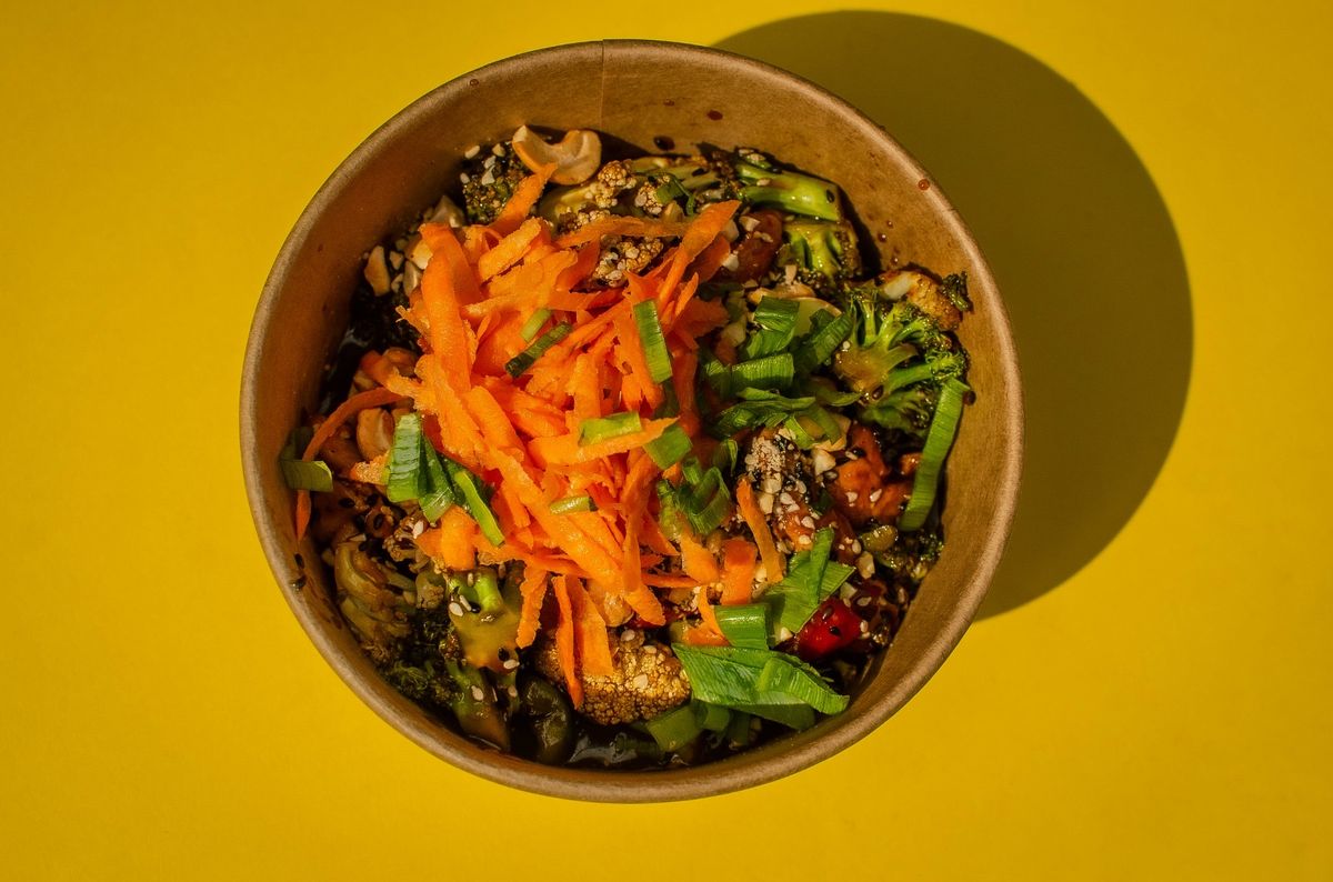 Pollo salteado en salsa teriyaki con brócoli, zanahoria, coliflor, apio, chile dulce y cebollino.