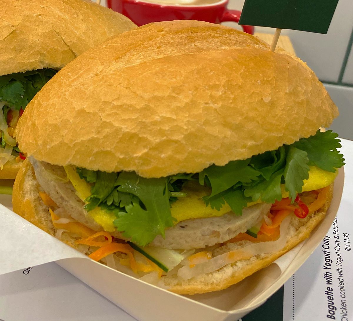 Choices of freshly sliced original chicken ham or garlic mushroom ham with fried egg, pate, homemade egg butter, coriander, cucumber, fresh chilies, pickled garlic & pickled carrots