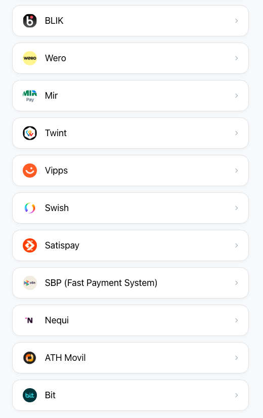 Popular wallets are added. Customers can easily copy payment details and open wallet apps.- BLIK, WERO, Mir, Twint, Vipps, Swish, Satispay, SBP, Nequi, ATH Mobile, Bit